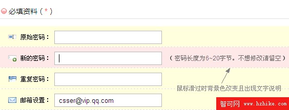 Codemoz! 會員信息修改的部分用到了這個效果,說難不難。要點是li:hover(IE6下使用JS模擬),CSS sprite。效果見下圖: