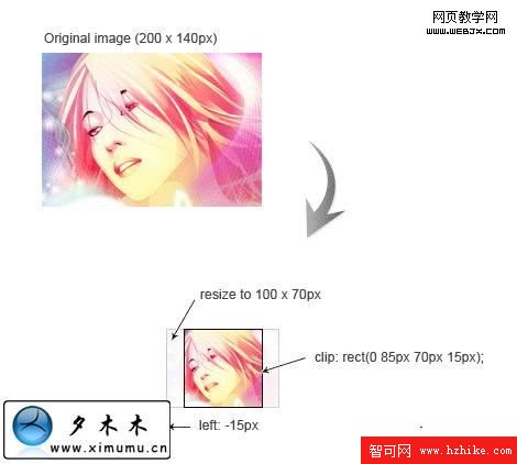 使用clip來演示如保剪輯在這個例子裡演示了如何使用clip來重設圖像的位置和尺寸.原圖像的大小如圖所示.現在要把這個圖像放到一個正方形的容器裡,並尺寸為原來的一半.現在來看如何來實現這個效果,首先用width,height來設置圖像的高度和寬度,然後使用clip來剪輯圖像.並讓圖像相對左邊15px.