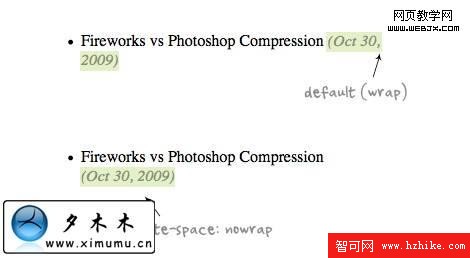 3. White-space white-space屬性設置或檢索對象內空格的處理方式.如white-space:nowrap會強行換行.