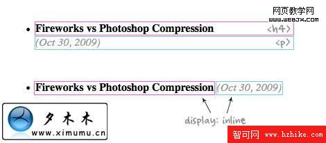 5. Display inline / block block元素占據一行,而inline則會在同一行顯示.<div>,<h1>,<p>標簽是block元素.<em>,<span>,<stong>標簽是內聯元素.但是你可以通過display:inline/block來改變元素的內聯和塊屬性.