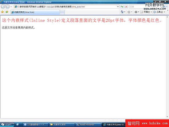 如上圖,我們可以看到,這種方式使用CSS是將style作為Html標簽的一個屬性加入的,也就是說,它還是沒有真正的把結構和表現分開,所以,這種方法用的比較少。下面我們來看第二種方法:
