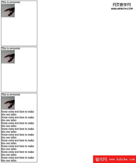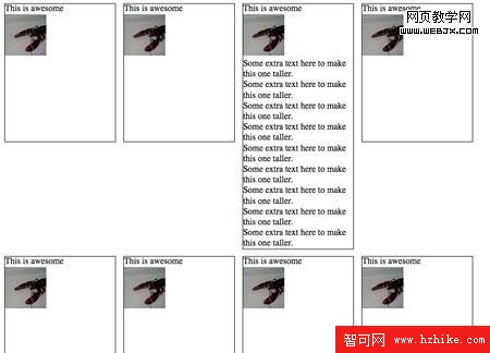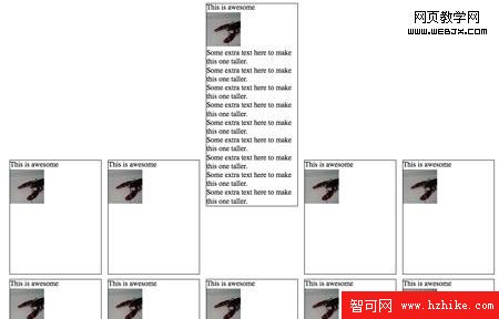 因為第一個展示項比其他項高,第五個項目就相對第一個浮動,而不是位於它下面了。基本上我們想要一個彈性表格的布局,但是適當的,語義標記。