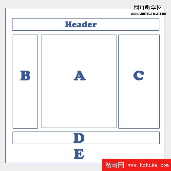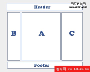 但是,我們常用的布局並沒有這麼簡單,除了三欄之外,我們還需要一個頁頭和一個頁腳,如下圖: