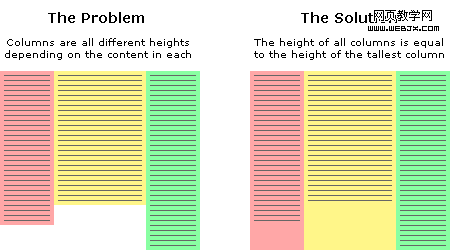 上例中有包含不同內容的 3 列,可以看出存在的問題是列的背景色隨著其包含內容的高度而自適應展開。這是我們要解決的問題。如何使所有的列等高?或具體的說,如何使所有列的高度等於最高列的高度?這很棘手,因為我們不清楚每列將會多高,哪一列是最高的。不能簡單的給所有列一個固定的高度,如果內容很少將會導致頁面底部有大片空白;如果內容太多則會在文字顯示完全前關閉。兩種情形都不妥。實際上,內容的長度是動態的,所以每列的高度也是動態的。必須意識到 Web 上沒有固定的東東,鄉民們有不同的屏幕分辨率,浏覽器中的文字也可能被設置為任意大小,所有這些都會影響內容的高度。