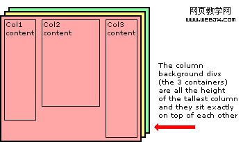 這是本文多列等高方法的核心。 使一個 div 的高度等於最高列高度的唯一方法是這個 div 包含所有的列。換句話說,通過把所有的列放在一個容器中,容器的高度就是最高列的高度。這是個非常有用的結構。