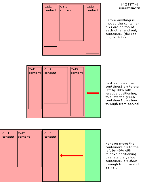 現在用相對定位把容器移至新的位置。移動後 div 如下圖所示。即等高列背景容器的層疊和位置。為了顯示右側的綠色列 container2 向左移了30%,為了顯示中間的黃色列 container1 向左移動了40%,與此同時紅色部分依然可見作為左側列。