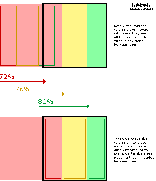 不過不用擔心...我們可以用完全不依賴於 padding 的方法來解決這個問題。相反,我們把列弄窄一點(列寬減去兩側的 padding),之後用相對定位把它們移至正確的位置。在我們的例子中我們用了 2% 的 padding,則 30% 的列將減至 26%,40% 的列減至 36%。用相對定位移回列時需謹記,現在列變窄了,所以當它們一起像最初那樣左浮動時,每一個需要比上一個移動更遠的距離。