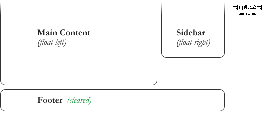 In the above example, the sidebar is floated to the right and is shorter than the main content area. The footer then is required to jump up into that available space as is required by the float. To fix this problem, the footer can be cleared to ensure it stays beneath both floated columns.
