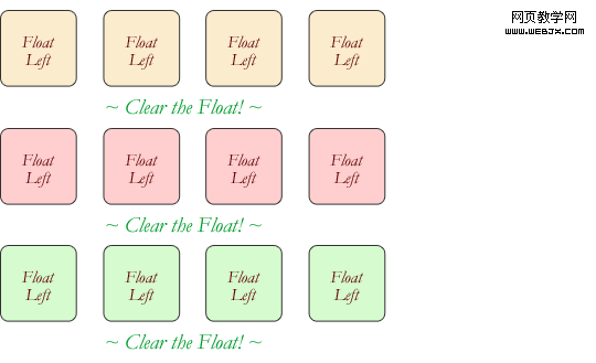 Float’s sister property is clear. An element that has the clear property set on it will not move up adjacent to the float like the float desires, but will move itself down past the float. Again an illustration probably does more good than Words do.