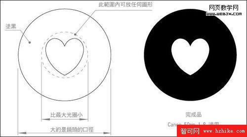 如何拍攝這種心型燈火照片?首先你需要一張厚紙片,一般的紙也可以,只要耐用一點就行了。在紙上畫一個心型,接著把心型剪下來。懶得畫的人就依照下圖的方式剪下圓形,然後直接印到紙上去吧。這是一名熱心的網友畫好的紙板,注意,這是以50mmF1.8鏡頭為例子的,其他口徑的鏡頭就需要自己畫了。