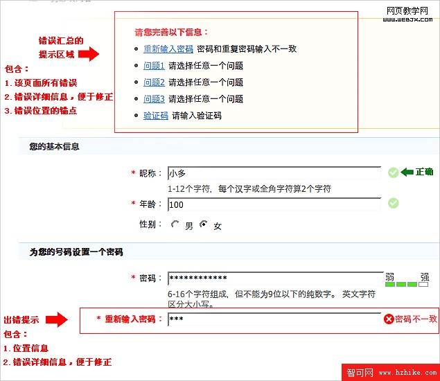 e.結果反饋出錯,最好提供錯誤匯總的提示區域。最好將錯誤和相關輸入項關聯起來。