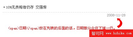 我們通常的做法是,把日期寫在span標簽裡,然後把span標簽寫在li裡,CSS定義span(float:right),讓span浮動在列表的右邊。
