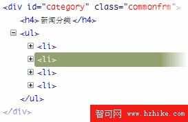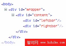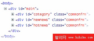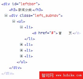 上面的圖是左列#leftbar的具體內容和結構。。其中定義了一個 .left_subnav,代表左列所包含的子導航條。。導航條一般都是用ul無序列表來搭建的,這種做法是符合Web標准的,所以不用擔心,怎幺樣。。有了良好的命名習慣是不是看起來更加容易了呢??其它的我就不解釋了。。很簡單。。同學們應該自己思考一下,這些標簽是什幺含義。。