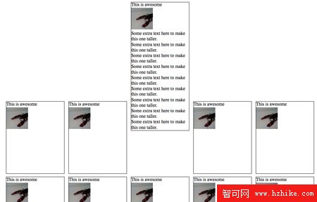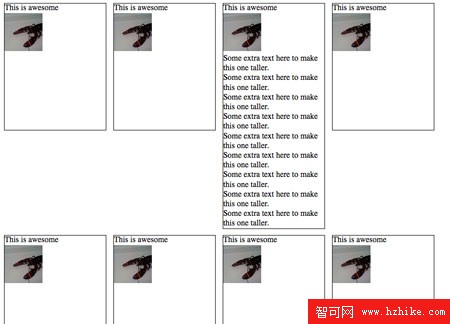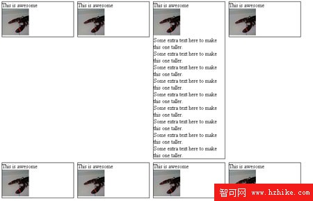 因為第一個展示項比其他項高,第五個項目就相對第一個浮動,而不是位於它下面了。基本上我們想要一個彈性表格的布局,但是適當的,語義標記。