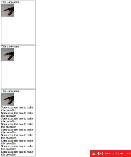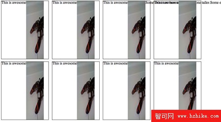 一般說來,這種類型的布局是小菜一樁。固定寬度,固定高度,向左浮動就解決了。但是,這個設計中內容的多少是可變的,這就意味著如果這些塊中的一些內容比其他的多,就會破壞這個布局。