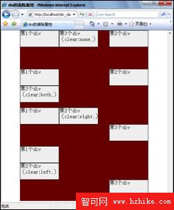 (2)為了更方便看到div的表現,筆者給內部div設置了淺灰色背景色和黑色邊框,而外部的div為深紅色背景色。在浏覽器地址欄輸入http://localhost/div_clear.htm,浏覽效果如圖11.10所示。