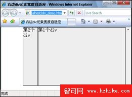 筆者特意把2個div設置為向右浮動,第1個div元素為自適應寬度,而第2個div元素為固定寬度。本例為了防止讀者的一個錯覺,即前面的div浮動後一定在左邊,其實左右方向取決於div元素浮動屬性的值。