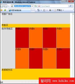 筆者稍微修改了XHtml部分的代碼,選了4個具體內容區加上了id名稱為content2的屬性,這是為了使這4個區域有不同的背景色。在浏覽器地址欄輸入http://localhost/ div_page.htm,浏覽效果如圖11.13所示。