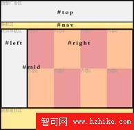 從分析圖可以看出整個頁面的結構,其中,#top代表廣告區、#nav代表導航區、#mid代表主體區、#left代表#mid所包含的左區域、#right代表#mid所包含的右邊區域、#bt代表版權信息區。