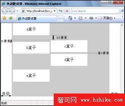 — 說明:讀者可以嘗試把b盒子的頂部邊距設置為5像素,這時b盒子和c盒子高度一致。d盒子無法“流”上來,d盒子將自動換行,位於b盒子下面。