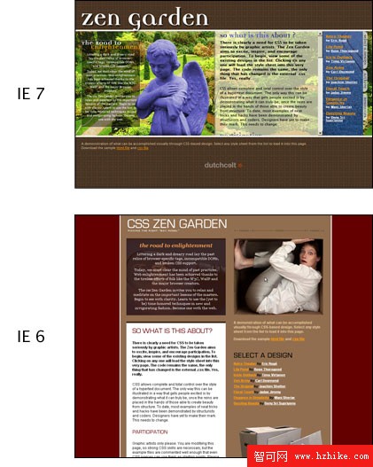 (圖示:Egor Kloos的CSS禅意花園作品(“雙雙”)在標准浏覽器和IE6中的呈現對比)