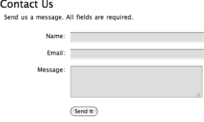 <form id="contact-form" action="#" method="post"> <fieldset> <legend>Contact Us</legend> <p>Send us a message. All fields are required.</p> <ol> <li> <label for="contact-name">Name</label> <input type="text" id="contact-name" name="name" /> </li> <li> <label for="contact-email">Email</label> <input type="text" id="contact-email" name="email" /> </li> <li> <label for="contact-message">Message</label> <textarea id="contact-message" name="message" rows="4" » cols="30"></textarea> </li> </ol> <button type="submit">Send It</button> </fIEldset> </form>