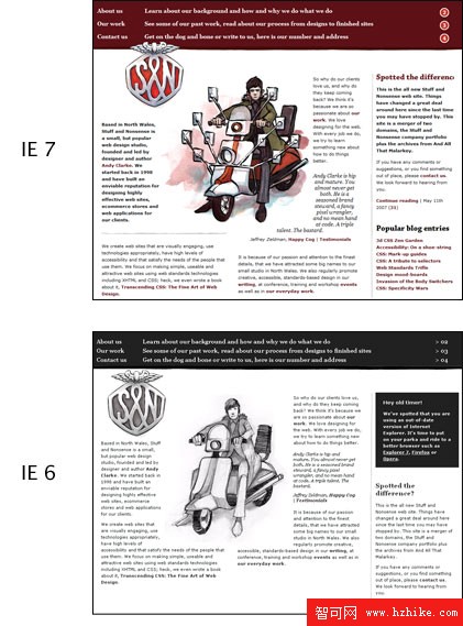 (圖示:Andy Clark的站點在標准浏覽器和IE6上的對比)