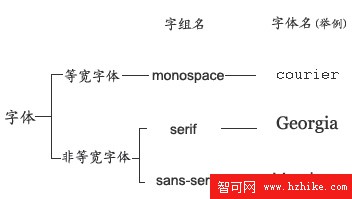 英文有那麼多字體, 但都隸屬於serif, sans-serif和monospace三種字組. 由於英文本身的特點, 不同於方塊字(漢字), 英文字母的寬度是不相等的, 這就給出版業如報紙的排版工作增加了難度, 於是發明了等寬字體(monospace).