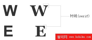 現在有必要解釋一下serif和sans-serif的區別. “sans”來源於古法語, 意為”without”, 即”非”. 而”serif”來源於荷蘭語, 譯為襯線, 指字母的拐角或端點位置的修飾線, 如圖所示: