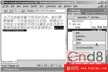 經過上面的改變有時不免給您帶來一定麻煩,如果遇到頁面中某個元素,比如突出顯示的文字的字體、字號以及顏色怎麼辦!這裡我們就需要再定義一個新的CSS樣式單來對其進行控制,右鍵點擊頁面編輯區,在彈出快捷菜單中點擊“CSS Style/Edit Style Sheet”命令,彈出“Edit Style Sheet”對話框,選擇列表中的all.css,點擊“New”按鈕,在彈出的“New Style”對話框中選擇“Make Custom Style(class)”的“Type”類型定義一個自己偏好的CSS控制。如果想更改頁面中某一元素的屬性,選中它然後右鍵單擊“CSS Styles”面板中“Apply Styles”中剛才定義的CSS,執行“Apply”命令就可以了(如圖2)。