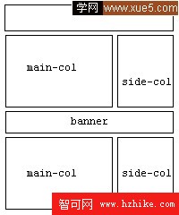 於是頁面做好了,網站做好了,上線了,運營了,訪問量大了。這時候公司決定,嗯,我們應該在一些頁面中加幾個通欄廣告。“通欄”哦!這就意味著它必須橫跨主欄和側欄,把它們倆攔腰截斷。於是我們重新“發明”一個樣式:banner,讓banner來一個clear:both; 然後放到頁面中間去阻止掉兩個欄的浮動。然後再在banner的後面繼續分兩欄。下面是示意圖: