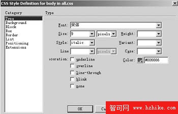 現在網頁中流行宋體的9pt和10.5pt的字體,按快捷鍵“Shift+F11”打開“CSS Style控制面板”,單擊“New Style”按鈕,彈出“New Style”對話框,復選“Redefine Html Tag”的“Type”類型,這時在Tag處會出現“body”、“br”、“cite”等選項,選擇“body”後確認。這樣我們就建立了一個外掛的CSS文檔,在保存對話框中保存為all後就進入“Style Definition for body in all.CSS”對話框(如圖1)。選擇“Category”中的“Type”項,定義“Font”為“宋體”、“Size”參數為“9”,其後的下拉框選擇“Points”、“Color”自定義為喜好顏色就可以了。當然還可以選擇“Category”中的“Background”項來定義“Background”顏色和其他背景屬性。這時您會看到頁面中內容的整體改變。