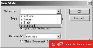 超級鏈接也是網頁中經常使用的,而網頁的鏈接色默認都是藍色,雖然可以更改,但單一色彩在不同背景色的網頁上顯示就不是那麼奏效了,我們來看一下如何用CSS控制網頁實現不同的個性鏈接顏色。在“New Style”對話框中,選擇“Use CSS Selector”的“Type”類型,在“Selector”下拉框中會列出“a:link(鏈接屬性)”、“a:hover(鼠標移動到鏈接上的屬性)”、“a:visited(鏈接被訪問後屬性)”、“a:active(鏈接焦點狀態下的屬性)”4個選項(如圖3),這4個選項的設置會控制網頁中所有的鏈接的屬性,我們可以分別定義這4個屬性,然後添加到“CSS Style”面板中與默認設置不同的CSS控制中,再將其“Apply”到需要改變的鏈接上就實現了。如果將“Hover”的字體設置的比“Link”稍微大一點,就會出現鼠標移動到鏈接上時字體變大的效果,試試看是不是很奇妙!