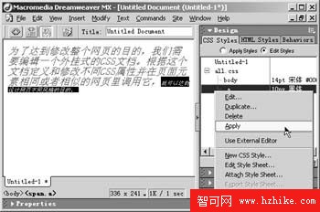 經過上面的改變有時不免給您帶來一定麻煩,如果遇到頁面中某個元素,比如突出顯示的文字的字體、字號以及顏色怎麼辦!這裡我們就需要再定義一個新的CSS樣式單來對其進行控制,右鍵點擊頁面編輯區,在彈出快捷菜單中點擊“CSS Style/Edit Style Sheet”命令,彈出“Edit Style Sheet”對話框,選擇列表中的all.css,點擊“New”按鈕,在彈出的“New Style”對話框中選擇“Make Custom Style(class)”的“Type”類型定義一個自己偏好的CSS控制。如果想更改頁面中某一元素的屬性,選中它然後右鍵單擊“CSS Styles”面板中“Apply Styles”中剛才定義的CSS,執行“Apply”命令就可以了(如圖2)。