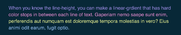 也有另一個技巧,你可以用linear-gradient()加上色彩點來控制顏色之間不會互相漸變,讓一個顏色結束之後突然開始另一個顏色。我們假設line-height的值為22px,那我們就可以讓漸變每逢22px斷開一次。