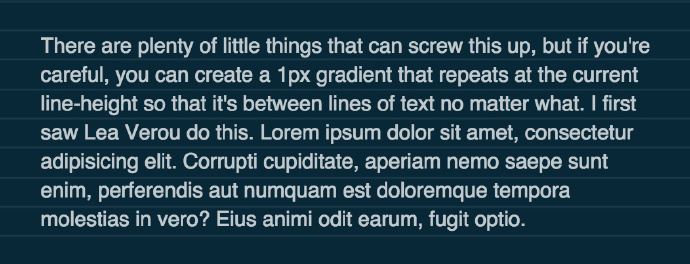 為了創造1px的線,我們需要知道line-height以像素為單位的值,然後減1。減1是為了讓漸變會准確的以已知的line-height來重復,並留出最後1px作為線。由於我們讓body的font-size為1em,也就是16px,所以line-height的單位被設置為em,你可以通過除去1em來移除單位,然後乘以16px再減1來得到我們需要的數值。