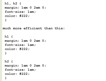 重復的屬性盡可能避免重復定義,而需要分組定義元素的屬性。如果您的h1和h2元素都是使用相同的字體大小、顏色、和邊框等,他們完全和可以合並成組定義。