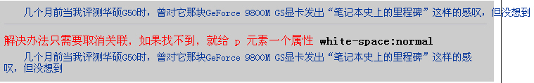 特殊情況:有時候你寫的東東,默認情況下並不自動換行,這多半是由於你在其他的CSS屬性設置裡,無意中關聯了那個段話。比如你的 p 元素無意中有了 white-space: nowrap