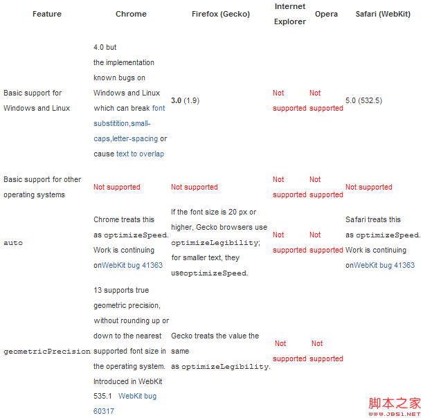 當繪制文本時,浏覽器會進行智能識別,何時應該從速度、清晰度和幾何精度方 面進行優化。關於各浏覽器對該屬性解釋的差別,參見下面的兼容性表格。