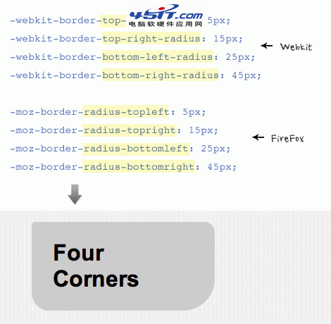 每個角都可以指定不同的寬度,注意每個角分開寫時Webkit和Firefox的差異。
