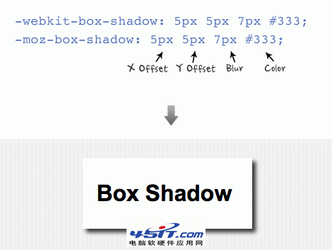box-shadow的屬性結構和text-shadow類似:x-offset, y-offset, blur, and color.