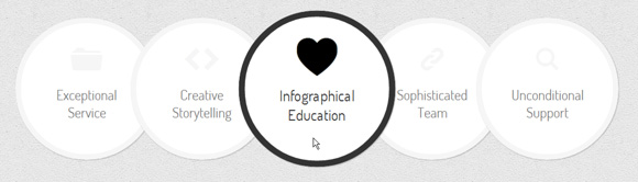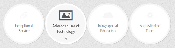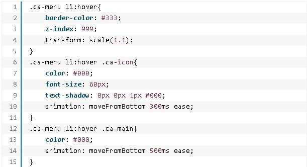 最後一個例子中,每個菜單項的左外邊距都是48像素,且相互重疊。當鼠標移上去時,環形菜單項整體變大,菜單的堆疊順序也上移(z-index是決定元素的堆疊順序)。最終就呈現出菜單項上浮的效果。