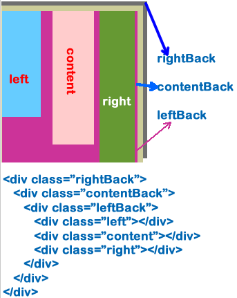 上圖中,不管我們哪一列的高度最高,那麼其三個容器“rightBack,contentBack,leftBack”的高度相應會隨最高列的高列變化,下面我們一起來看其實現過程: