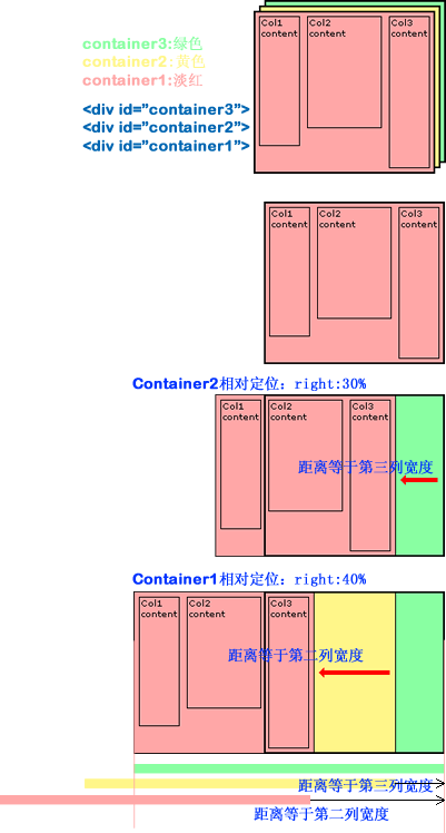 下圖是實現上面的第二步對應的示例圖,也就是容器“div.rightWrap”,“div.contentWrap”,“div.leftWrap”進行相對定位(position: releative),並展示了如何設置對應的“right”值。