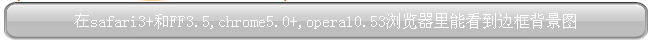 <div style="-webkit-border-image: url(images/whiteButton.png) 0 12 0 12 stretch stretch; -moz-border-image: url(images/whiteButton.png) 0 12 0 12 round stretch; border-image: url(images/whiteButton.png) 0 12 0 12 stretch stretch; display: block; width:600px; border-width:0 12px; padding:10px; text-align: center; font-size: 16px; text-decoration: inherit; color:white;+color:black;">在safari3+和FF3.5,chrome5.0+,opera10.53浏覽器裡能看到邊框背景圖</div>