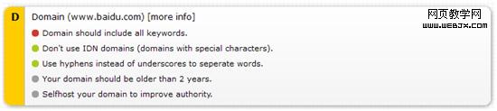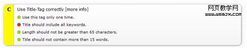 頁面構建的工作不僅是要讓頁面盡可能的達到設計稿的藝術要求,網絡傳輸的速度要求,還要為搜索引擎更容易找到你做出相應的努力。以前我們相對少得談 及此,SenSEO是一款SEO診斷的火狐插件,你打開面板在裡面輸入你的關鍵字,之後點擊後面的幾個按鈕。可以給你一個綜合打分,分析你的Title、 Description、 Keywords、robots、Number of Words、Number of matching Keywords、Keyword-Density、Number of HTML等等。這個插件提出的有一些分析建議還是很有借鑒意義的。