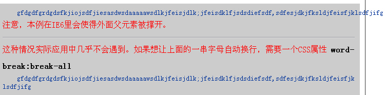 案例分析:上面兩個圖,沒有使用任何排版的CSS屬性,也就是默認情況下,塊元素裡的文本,達到邊緣以後會自動換行。但是這裡有個特例:就是內容全部為英文字母(沒有單詞句子,沒有詞和詞之間的空格),此時文本就不自動換行了(見下圖)