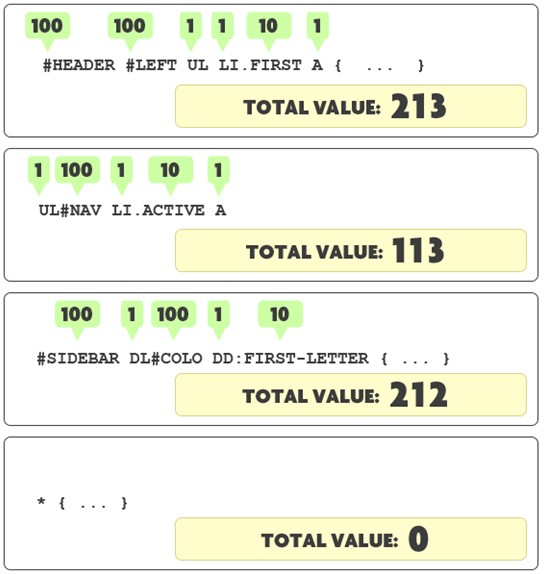 我們把特殊性分為4個等級,每個等級代表一類選擇器,每個等級的值為其所代表的選擇器的個數乘以這一等級的權值,最後把所有等級的值相加得出選擇器的特殊值。