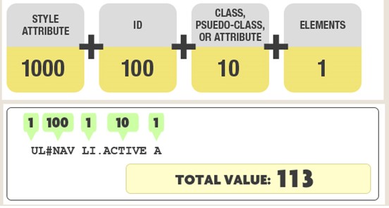 例如上圖為例,其中#NAV為二等選擇器,.ACTIVE為三等選擇器,UL、LI和A為四等選擇器。則整個選擇器表達式的特殊性的值為1*100+1*10+3*1=113