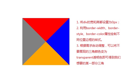 如上圖所說,利用border邊框屬性,填充我們不想要的顏色為透明色,即可得到某一部分三角形,代碼和圖片效果如下。